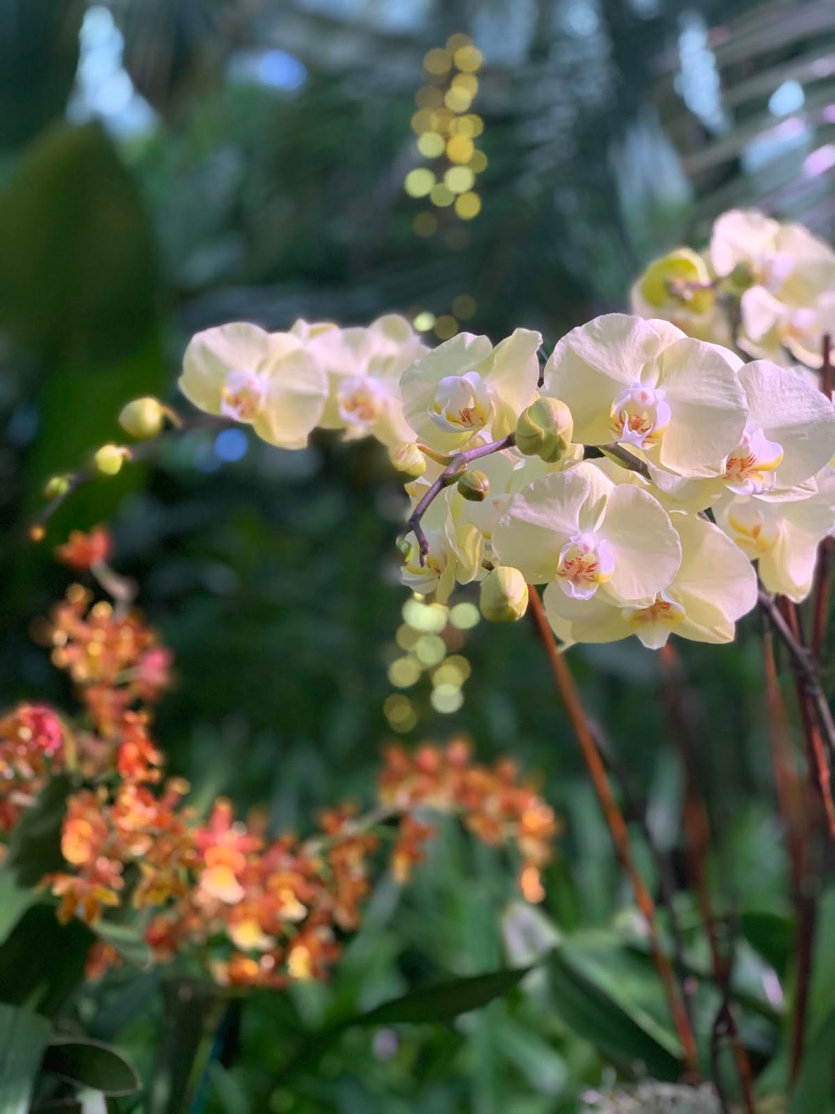 There was definitely a vibe. As we entered the first greenhouse, the sun was still brightly lighting up everything from the hot ceilings above, its warmth reaching down to all the plants and our skin. There were neon lights of different colours in their slim glass tubes, each backlighting the form of the numerous orchid blossoms, each stem using the long electric vials as support. Natural or not, the interplay between these two forms, the world of the biological along with the manmade object, was a really fascinating combination to gaze at. Of course, the blue lights along with the purple orchids caught my eye immediately, those being two of my favorite colours.